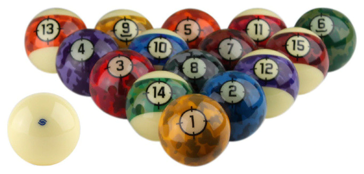 The Aramith Camouflage Billiard Balls set features a beautiful up-to-date camo design. Not necessary to hunt nor to be in the armed forces to play with the camouflage set. But one thing is sure, the game is raised to the next level : a combat mission.