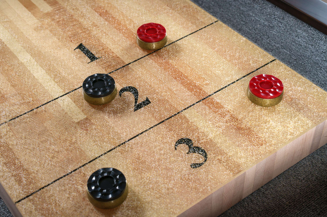 The Doc & Holliday George Shuffleboard Table offers a stunning antique coffee finish that adds a touch of elegance to any space. This 12ft shuffleboard table is meticulously crafted with solid wood construction, ensuring durability and longevity. The maple butcher block playfield provides a smooth and level surface for optimal gameplay. It allows for precise puck control and enhances the overall playing experience. To get you started right away, this shuffleboard table includes all the necessary pucks. You won't have to worry about purchasing them separately. For a hassle-free installation, we highly require  white glove installation. The professional installers will handle the entire setup process, ensuring that your shuffleboard table is perfectly positioned and ready for play.
