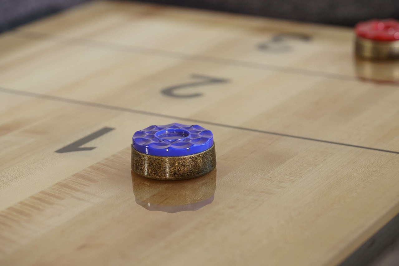 Includes: 4 black pucks & 4 red pucks, abacus scorer, table brush, wax, and fitted cover.