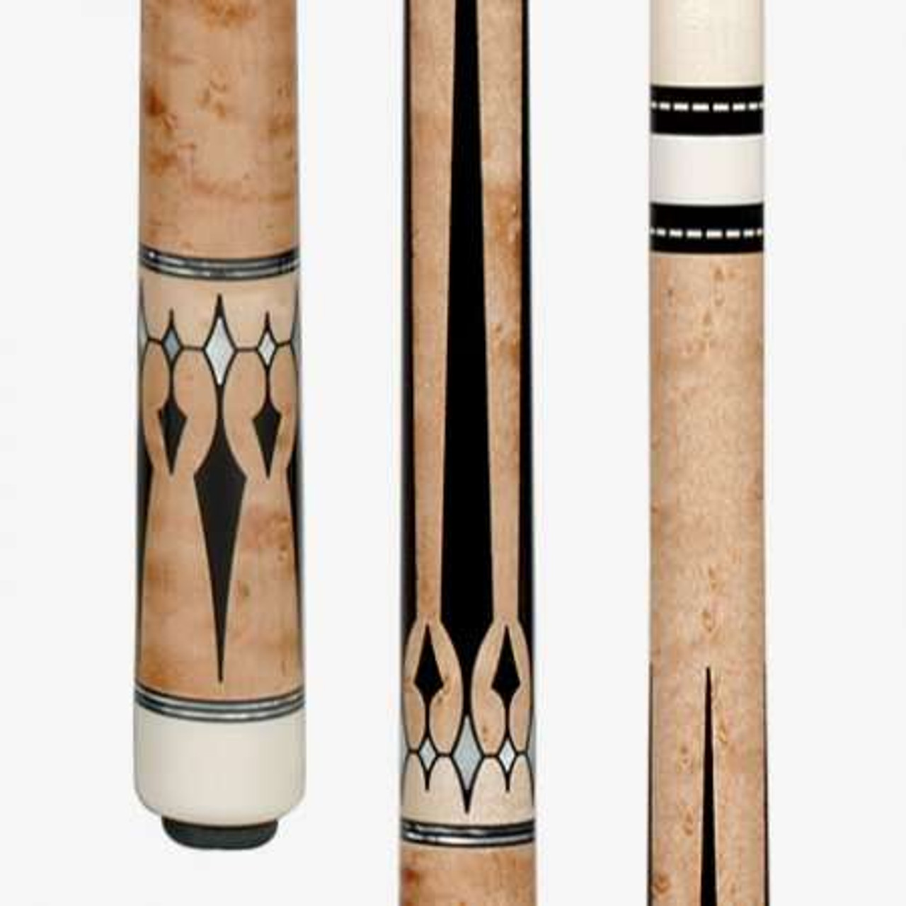 This classically-styled Pechauer cue features a Ebony stained Birdseye Maple forearm and butt, black & white double-pressed Irish linen wrap, and an 8-coat, hand sprayed, finish polished to a high gloss.